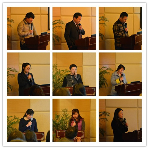 總結匯報后,對2014年度“新新”的優秀員工進行了表彰和頒獎;獎項分為個人獎和團體獎,依次揭曉了最佳新員工獎、進步員工獎、最佳服務獎、銷售增長獎、最佳業務員獎、最佳新作品獎、最佳作品獎、優秀主管獎、優秀員工獎、物流發驗準確小組獎、銷售團隊獎、最佳團隊獎等12類獎項,主持人盛總,宣讀了領導對他們的評價后,獲獎人上臺領獎,公司領導王董、楊總、盛總、李總、胡總分別為他們頒獎并合影留念,獲獎員工發表了真誠的獲獎感言!