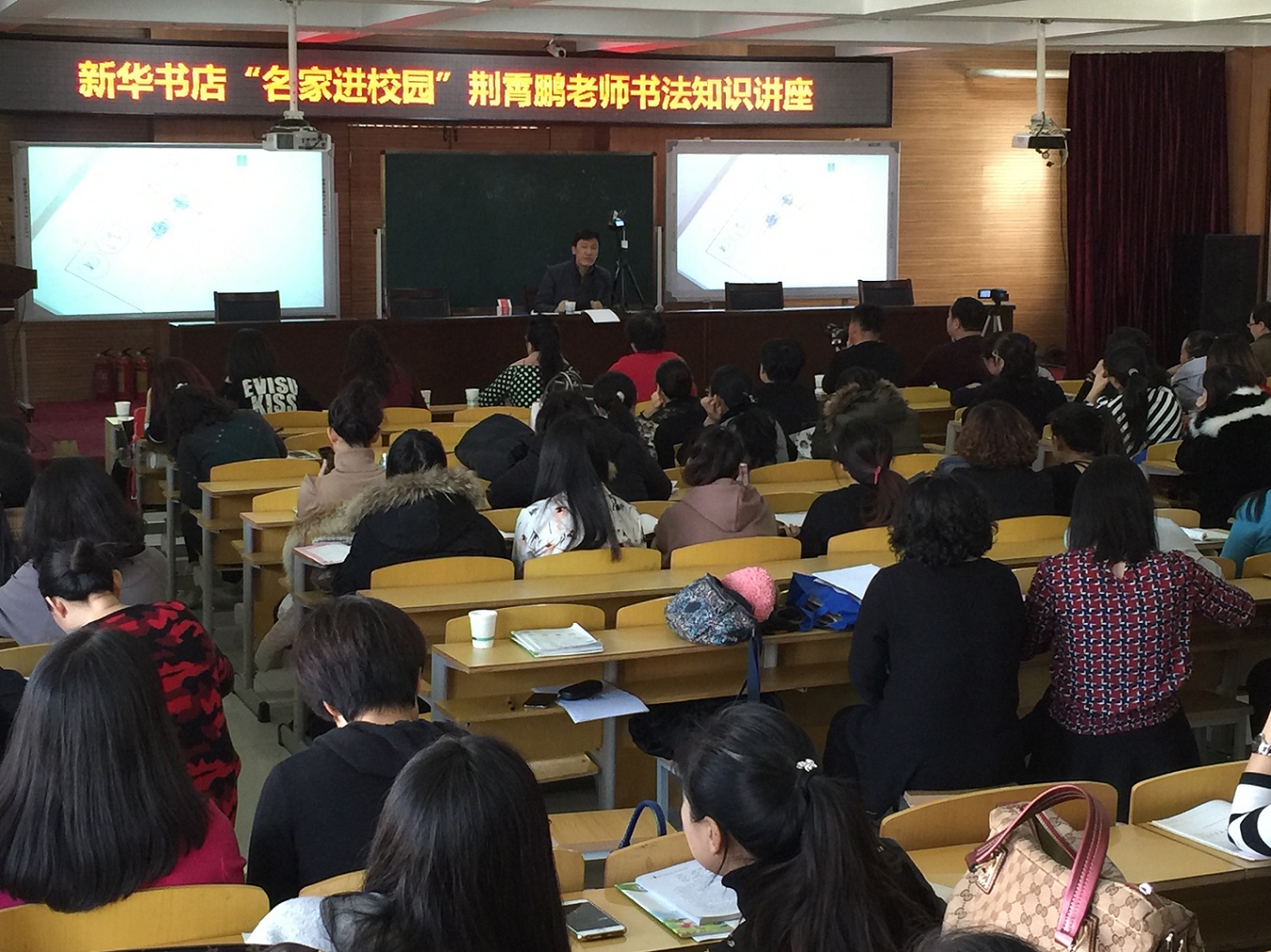 上午活動地點:內蒙古赤峰市紅山區第17小學。來自第十六小學、第九小學、第十一小學等十所學校的老師和領導約360人參加了活動,現場座無虛席。講課內容圍繞硬筆方面的知識,“如何練好字”,“如何教孩子們寫好字”,荊老師現場親授平時經驗,并輔以書法基本知識來講解。