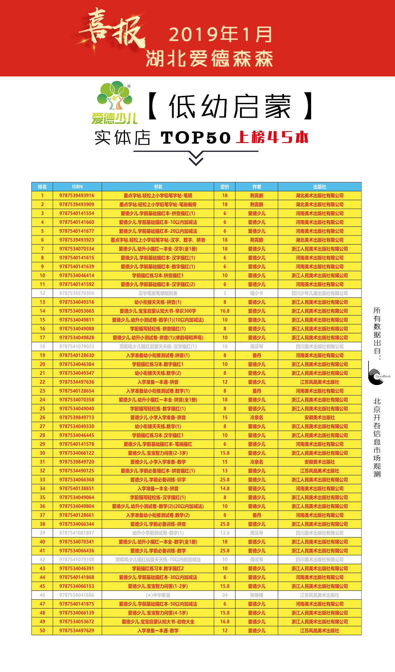 火熱的銷(xiāo)售是對(duì)產(chǎn)品質(zhì)量的最好認(rèn)證!據(jù)行業(yè)權(quán)威機(jī)構(gòu)統(tǒng)計(jì)數(shù)據(jù)顯示,2019年1月“低幼啟蒙”類(lèi)圖書(shū)排行榜前50強(qiáng)中,“愛(ài)德少兒”系列品牌圖書(shū)占據(jù)45本!