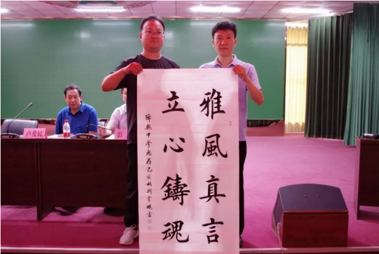 在講座中,荊霄鵬老師從硬軟筆書法入手,介紹了書法的概念與要素、書法與傳統文化、中國歷代書法大家書法作品賞析、書法名詞解釋、硬軟筆書法練習技巧分享等,并對常見的問題進行了解答。隨后荊霄鵬現場揮毫寫下“雅風真言,立心鑄魂”贈予絳縣中學。