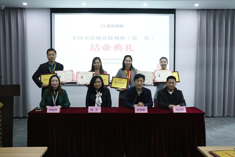 隨后,結業作品點評和結業典禮在新新集團會議室舉行。荊霄鵬老師、陳汝懷老師和武漢市新新傳媒集團有限公司創始人楊朵女士、武漢市新新傳媒集團有限公司總編輯胡曉燕女士一起為學員頒發了結業證書和“規范字培訓師”牌匾,墨點書法教育研究院全國書法師資特訓班(第一期)圓滿結業。