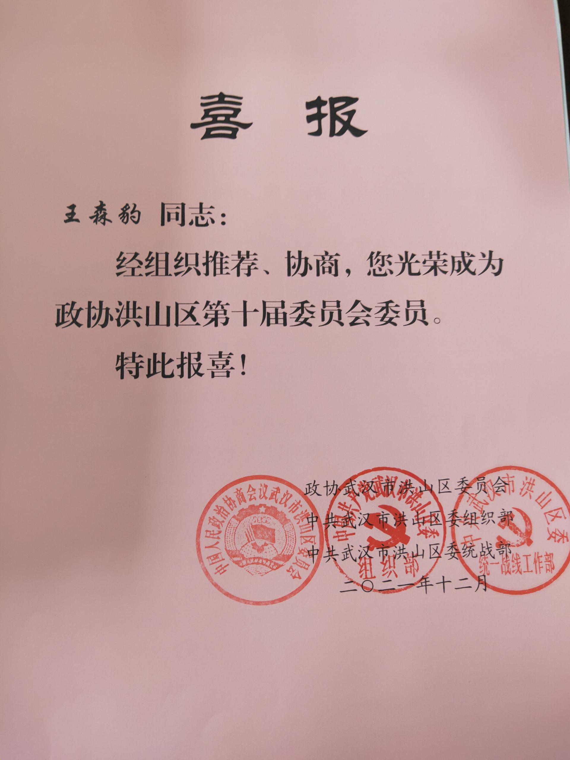 近日,政協武漢市洪山區第十屆委員委員會發布公告,根據《政協章程》關于政協委員會任選的相關規定,我司董事長助理兼電子商務部經理王森豹同志經組織推薦、協商,光榮成為政協洪山區第十屆委員會委員。